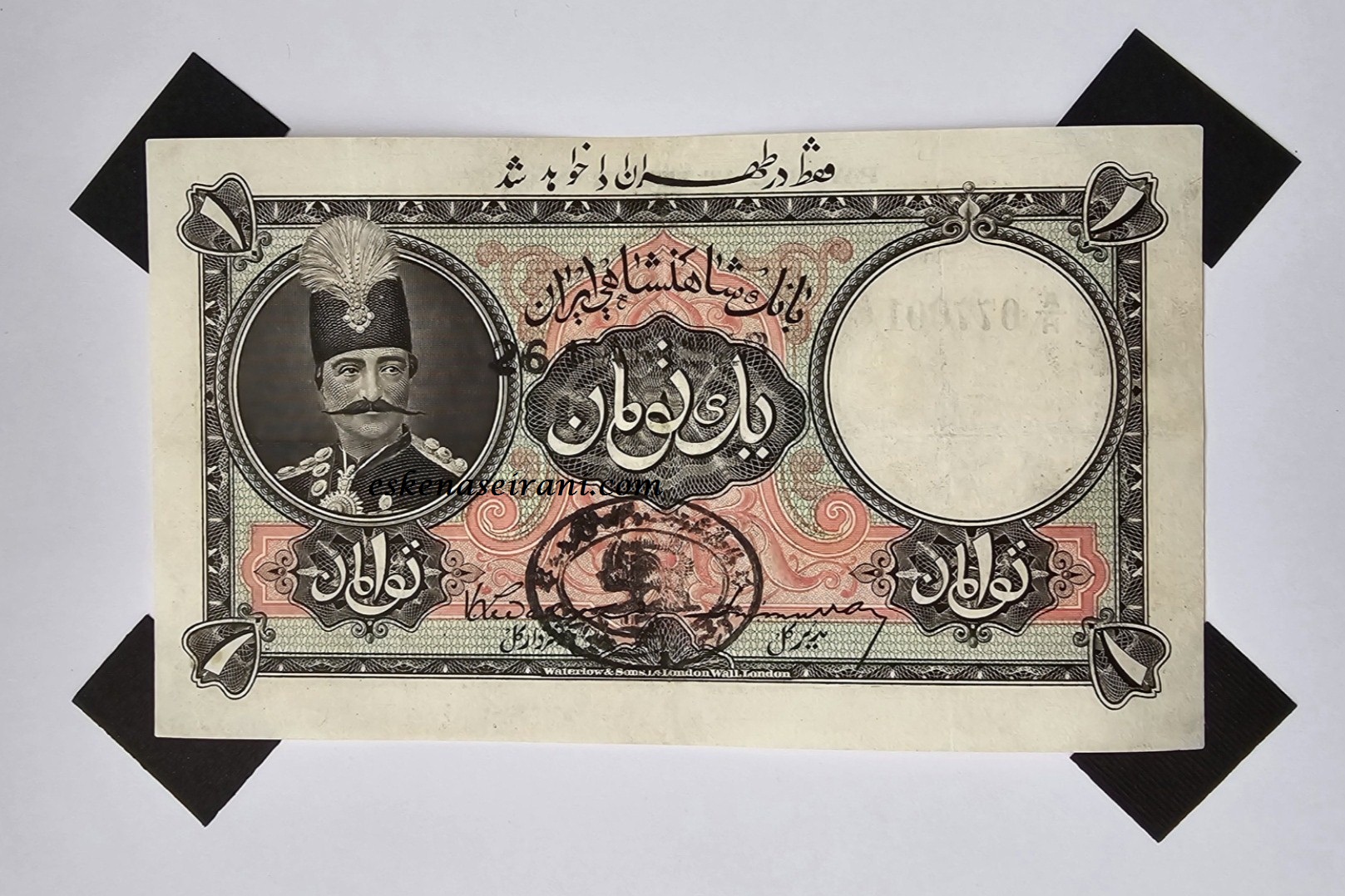 اسکناس : 1 تومانی سری اول قاجار تاریخ 1900 بسیار کمیاب تر از 1 تومانی وان ONE میباشد
